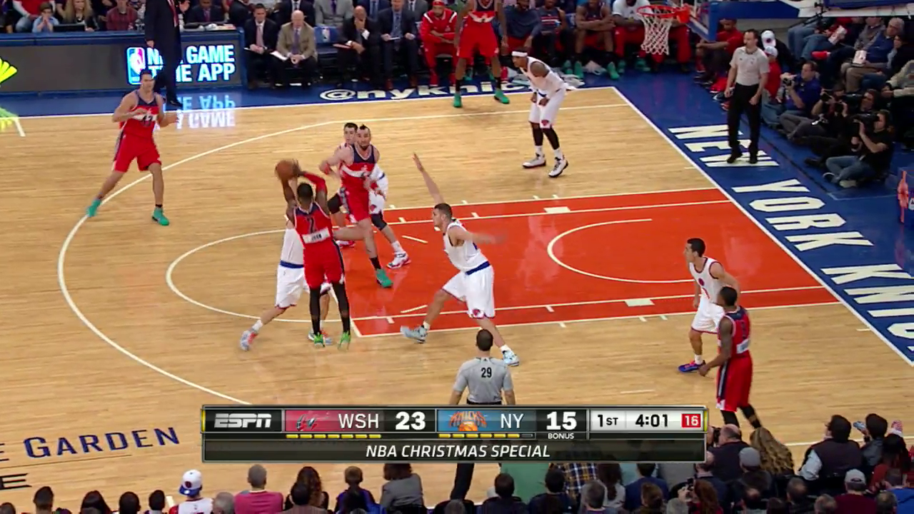 Wall is a master at picking defenses apart, predicting the following chain of events seconds before they actually happen. Put him in the pick-n-roll against Jose Calderon and the Knicks and an open shot is a foregone conclusion. Let’s look at this series of three back-to-back possessions which end with a John Wall pick-n-roll.